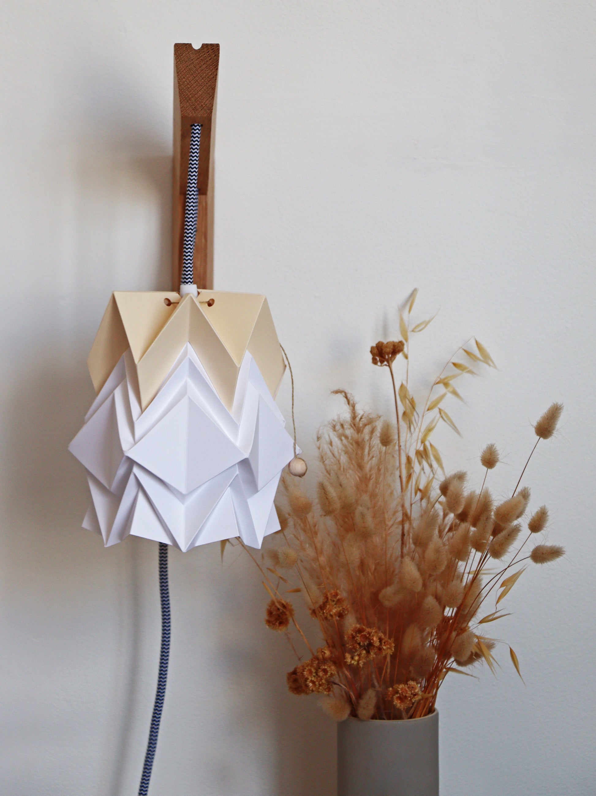 MOKUZAI is a wall lamp composed by an oak wood bracket, a high quality origami paper pendant light and a textile cable with switch.