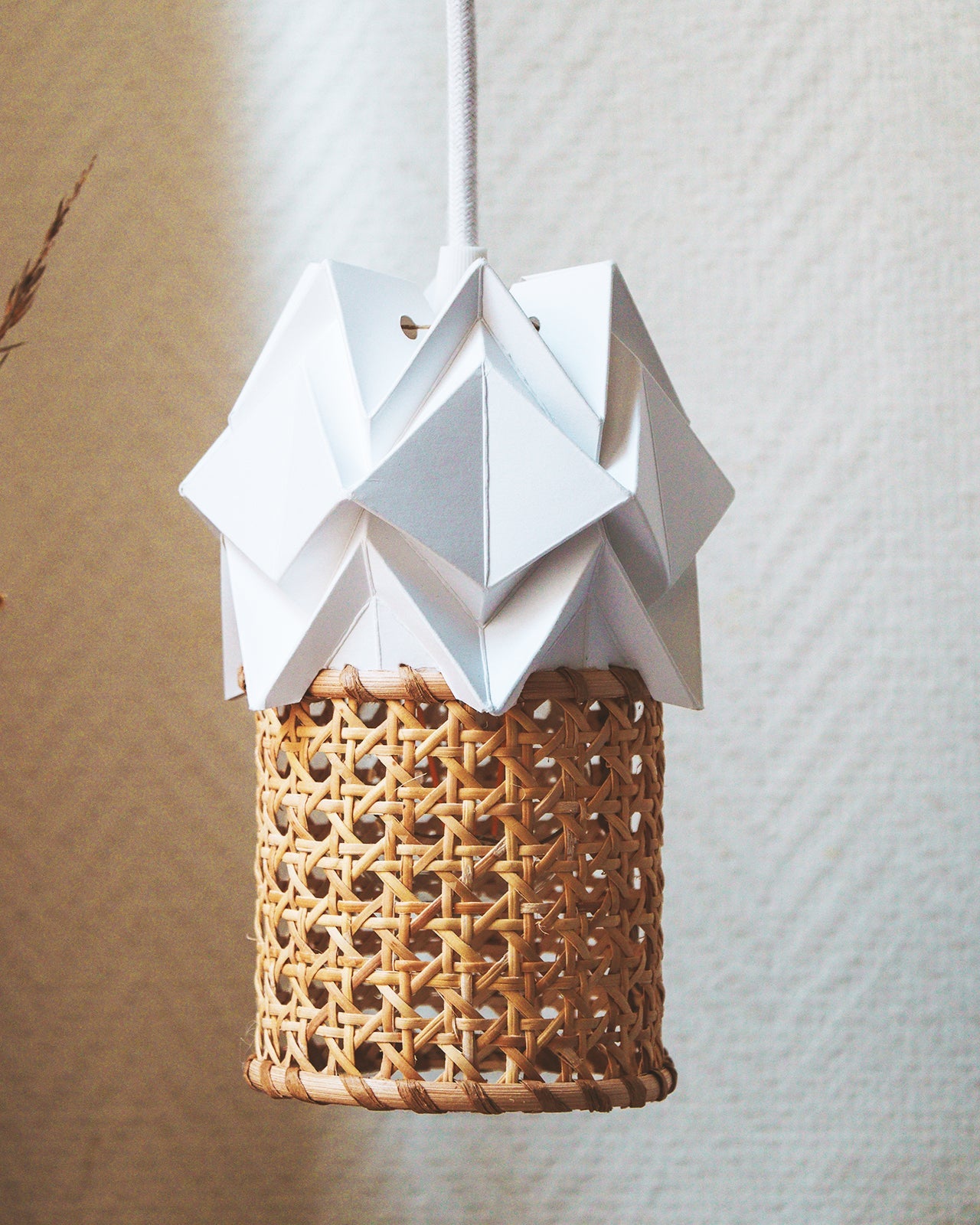 ORI is a meticulously crafted light featuring a unique two-materials design that combines the delicate forms of origami with the natural warmth of rattan.