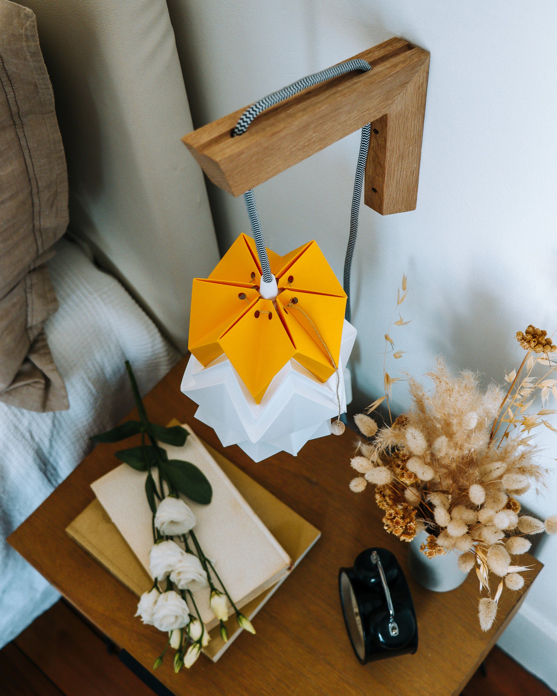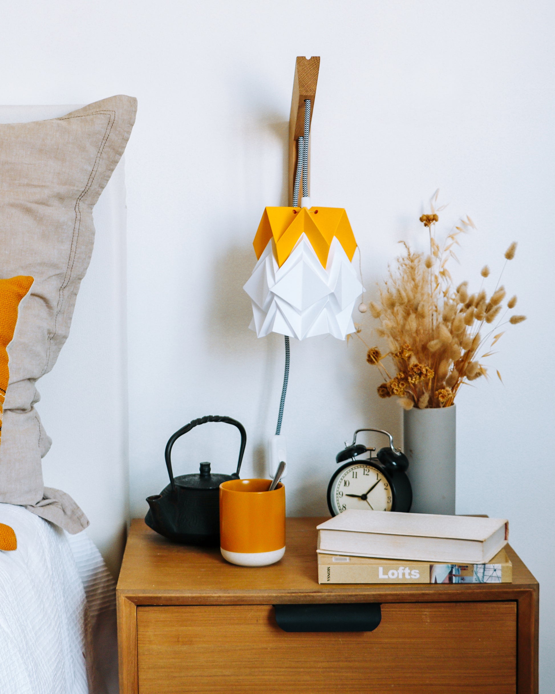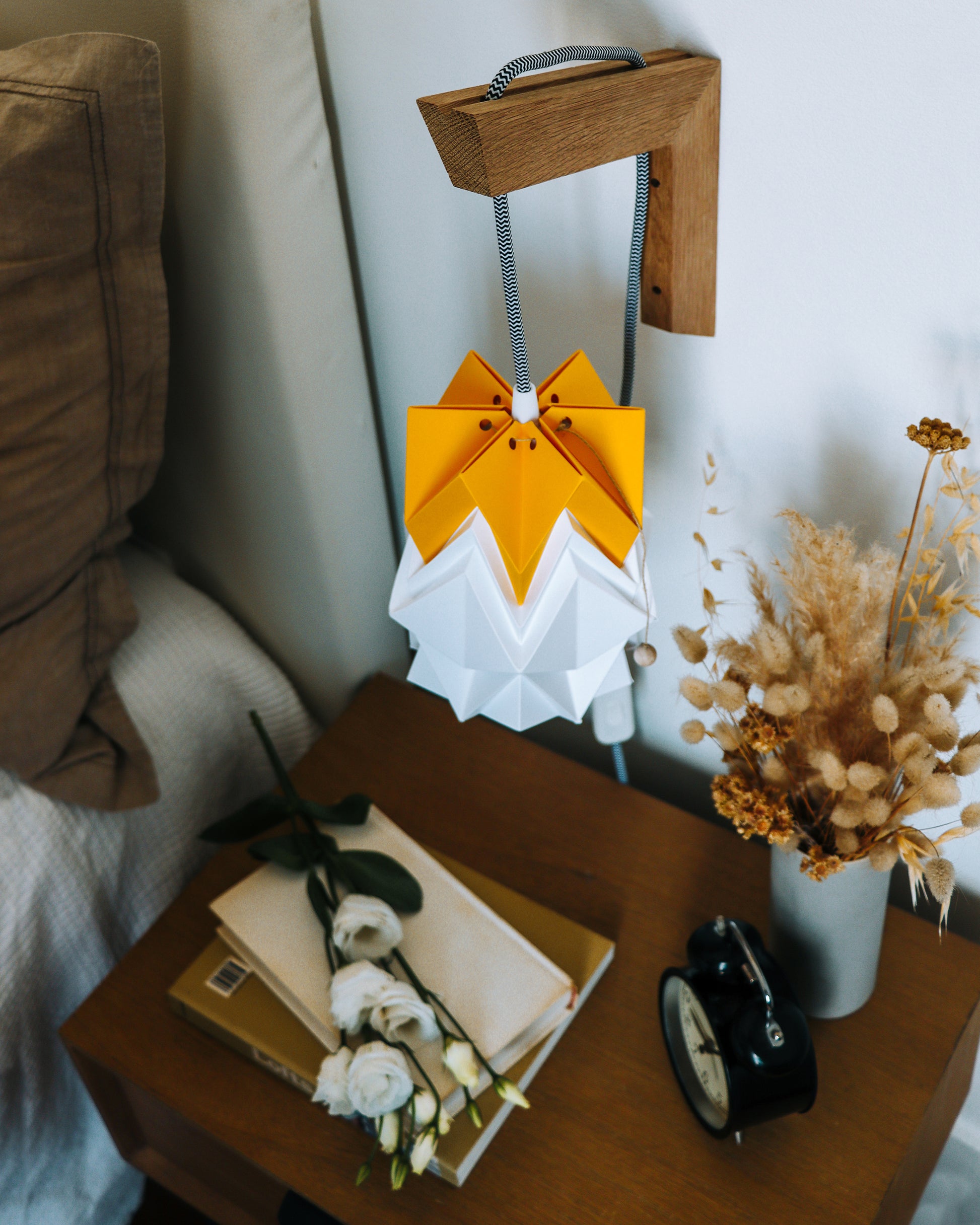 • L'abat-jour en origami est également déjà monté et prêt à être installé une fois le support fixé au mur.
