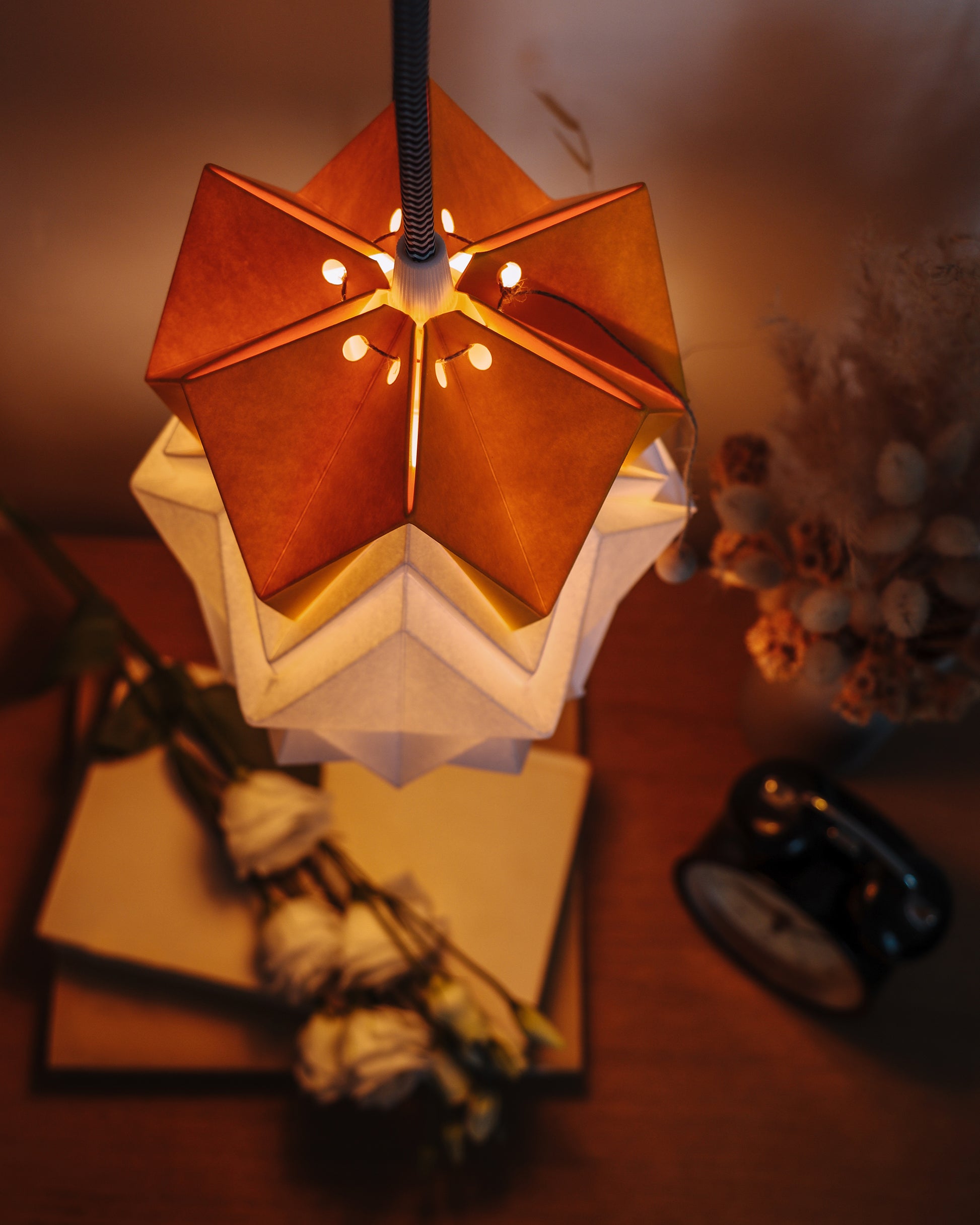 Objets d’éclairage intemporels, nées de l'alliance entre la précision de la technique ancestral de l’Origami Japonais et l’élégance et simplicité du design scandinave.