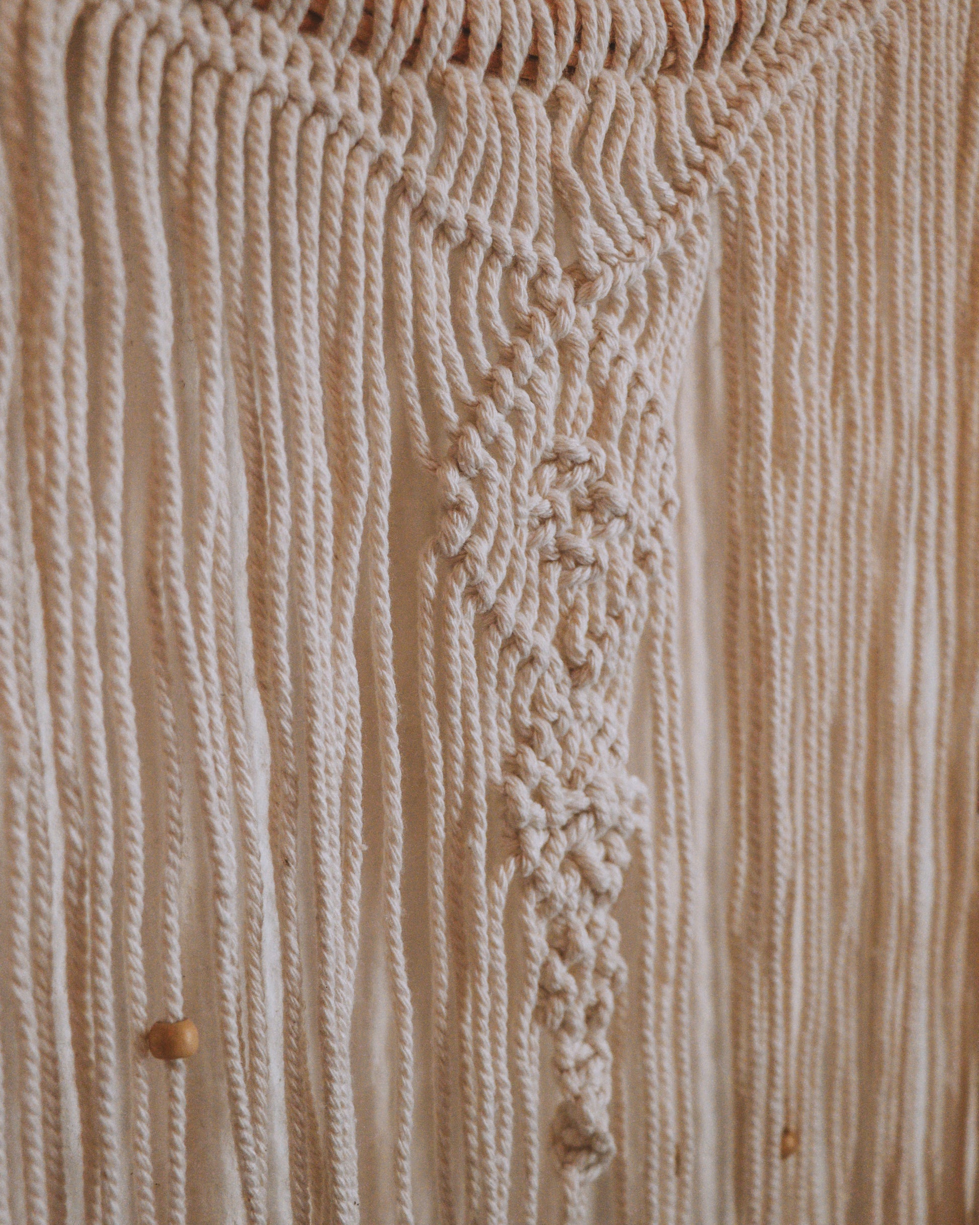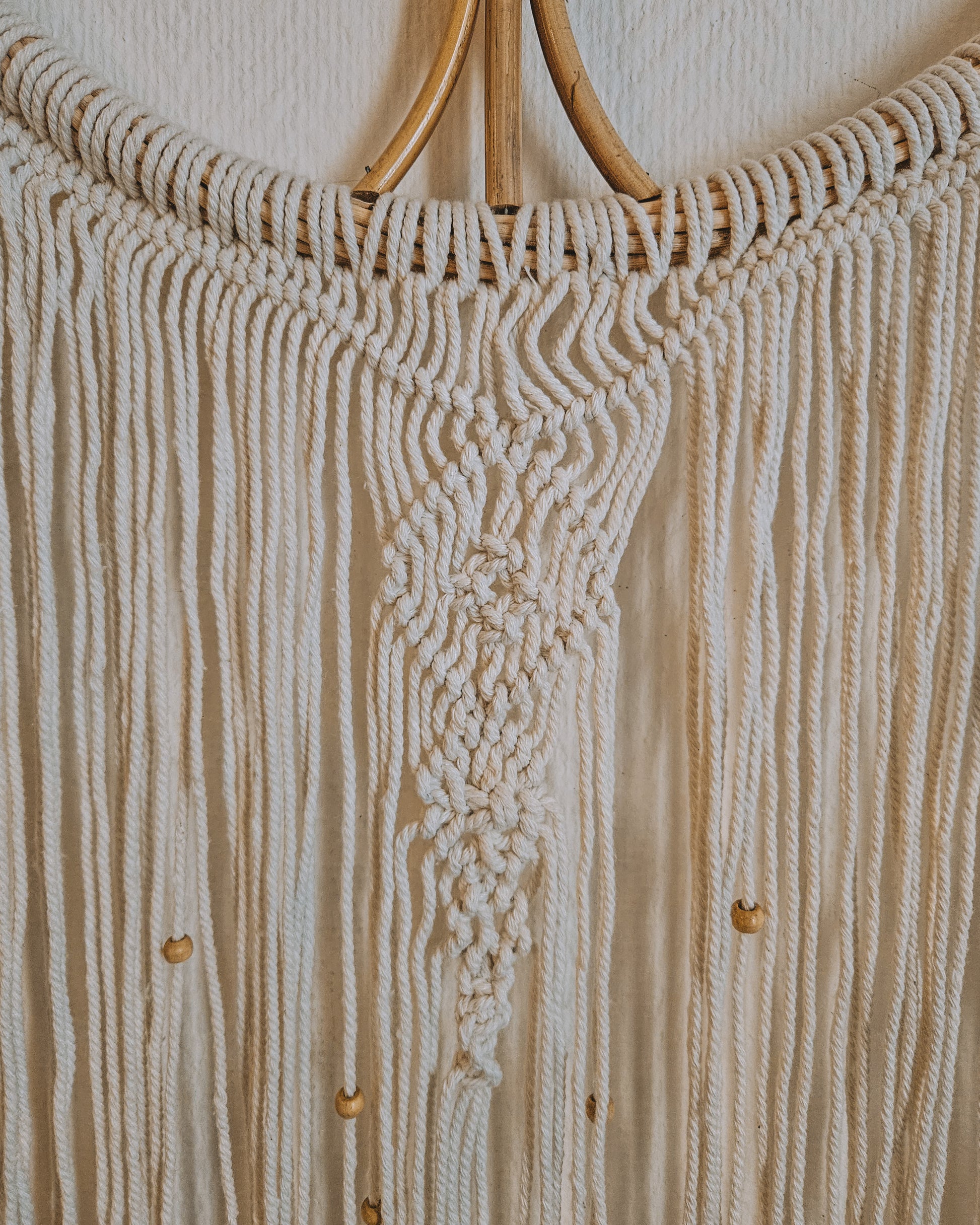 La douce cascade du macramé sous le rotin ajoute une sensation de mouvement et de vie.